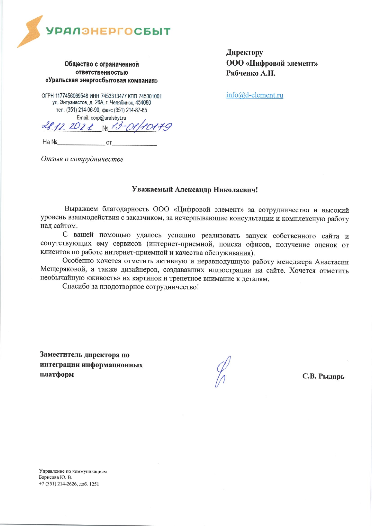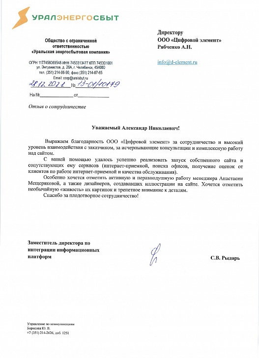 Выражаем благодарность ООО «Цифровой Элемент» за сотрудничество и высокий уровень взаимодействия с заказчиком, за исчерпывающие консультации и комплексную работу над сайтом. С вашей помощью удалось успешно реализовать запуск собственного сайта и сопутствующих ему сервисов (интернет-приёмной, поиска офисов, получение оценок от клиентов по работе интернет-приёмной и качества обслуживания). Спасибо за плодотворное сотрудничество!